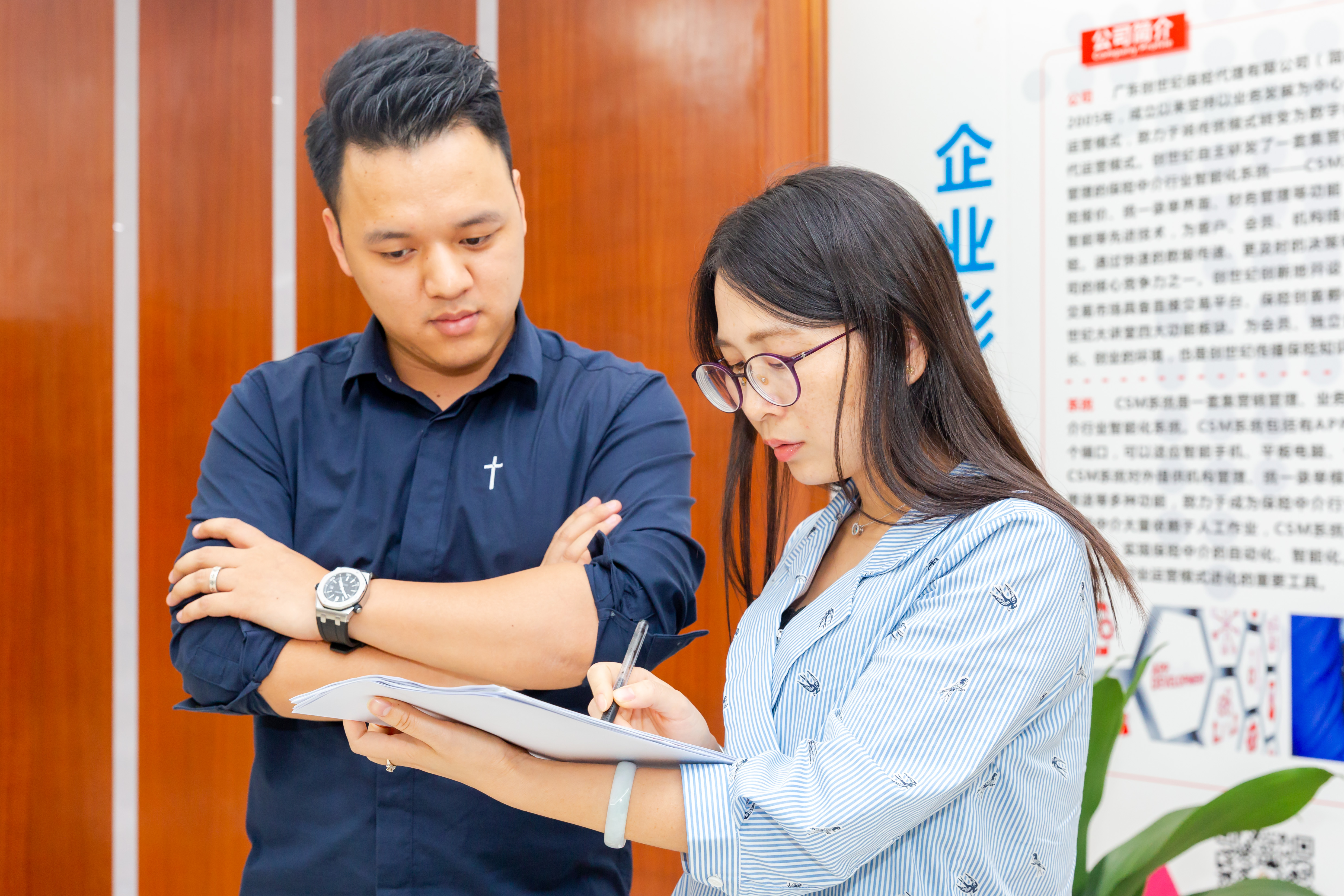 创世纪保险代理公司员工(右)为客户提供保险咨询服务。/佛山日报记者符诗贺摄