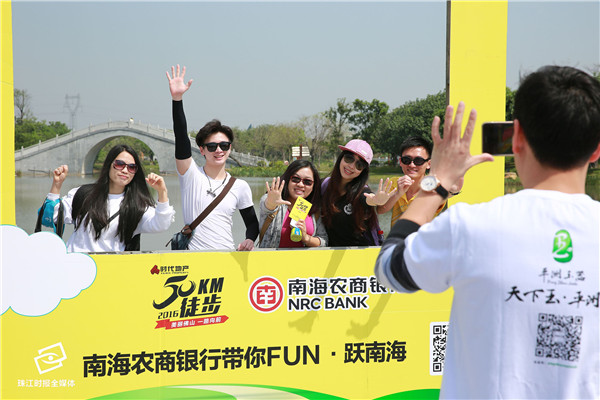 参加徒步的市民在桂城映月湖公园签到留影。2016年,佛山50公里徒步首次举办,市民感受城市之美。