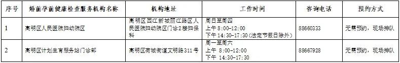 答:一方或双方为高明区户籍或高明区居住满6个月(以持有效《广东省居住证》)的登记结婚人员,可享受一次免费婚前孕前健康检查服务,可在预约结婚登记后至怀孕3个月内享受一次免费婚前医学检查;符合再生育政策的,按规定每孩次可继续享受一次免费孕前优生健康检查服务。