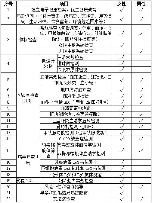 答:免费婚孕检已升级为22个检查项目,包括建立健康档案、询问病史、体格检查、实验室检查11项、病毒筛查4项、妇科超声常规检查、风险评估和咨询指导、早孕和妊娠结局追踪随访、艾滋病检查,男女双方检查内容见下表: