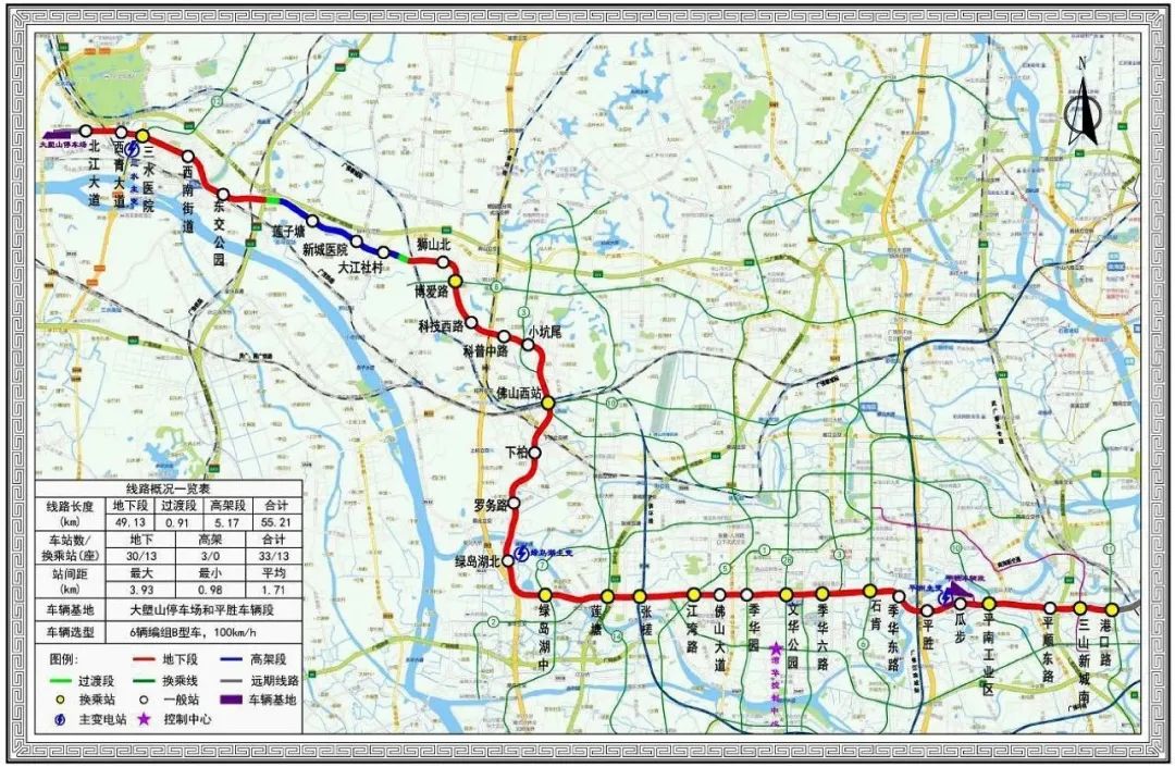 佛山市地铁4号线一期工程西起北江大道站,东至港口路站,线路全长55.21公里;设33座车站,其中3座为高架站,其余30座均为地下站;设平胜车辆段1座,大塱山停车场1座;设三水、绿岛湖、平洲等3座主变电站;由湾华控制中心统一调度。