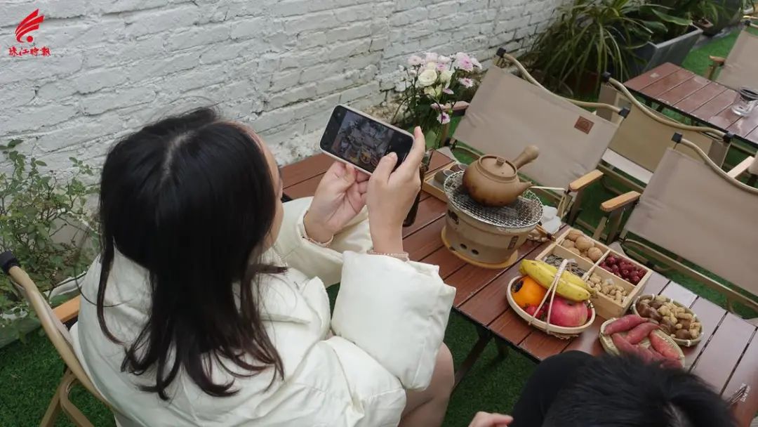 近期,南海桂城的紫金城、夏北社区宝华“网红街”、 天安中心等地,都出现了相同的景象:三两好友围着炭火炉,煮一壶茶,烤上柿子、红薯、板栗等水果零食,举杯慢饮,促膝长谈。