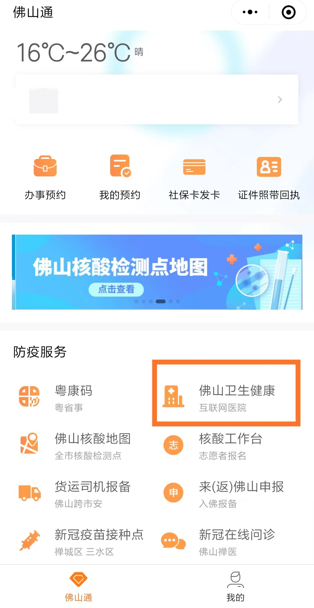 1.微信搜索【佛山通】,进入佛山通微信小程序,在首页找到【佛山卫生健康】服务。