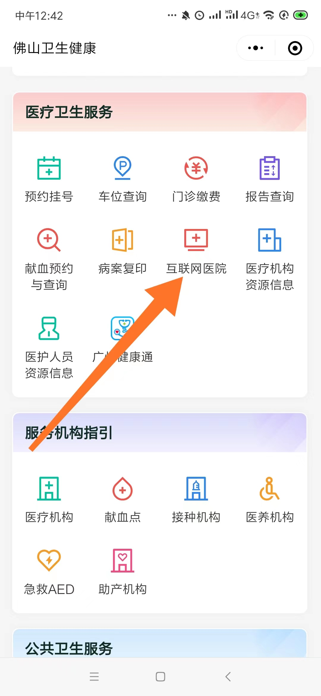 2.进入【佛山卫生健康】服务,在首页找到【互联网医院】。