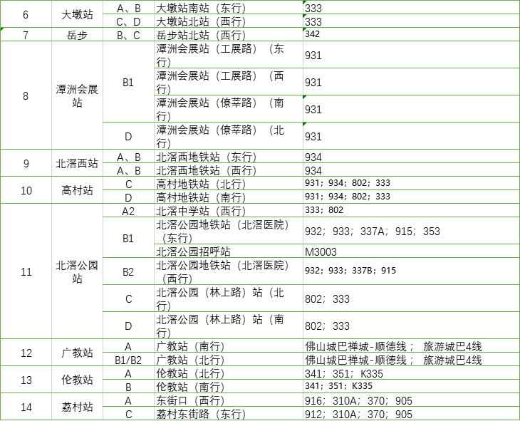 途经站点:季华六路东站【接驳三号线季华六路站】、环湖花园站、亚洲艺术公园B站【接驳三号线亚艺公园站】、湖景苑站