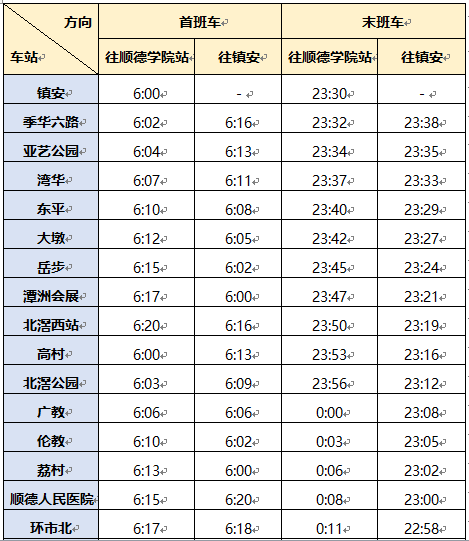 佛山地铁3号线首通段全程约55分钟,高峰行车间隔5分43秒、平峰行车间隔8分34秒。镇安站、顺德学院站首班车分别为6:00、6:05,末班车分别为23:30、22:45。