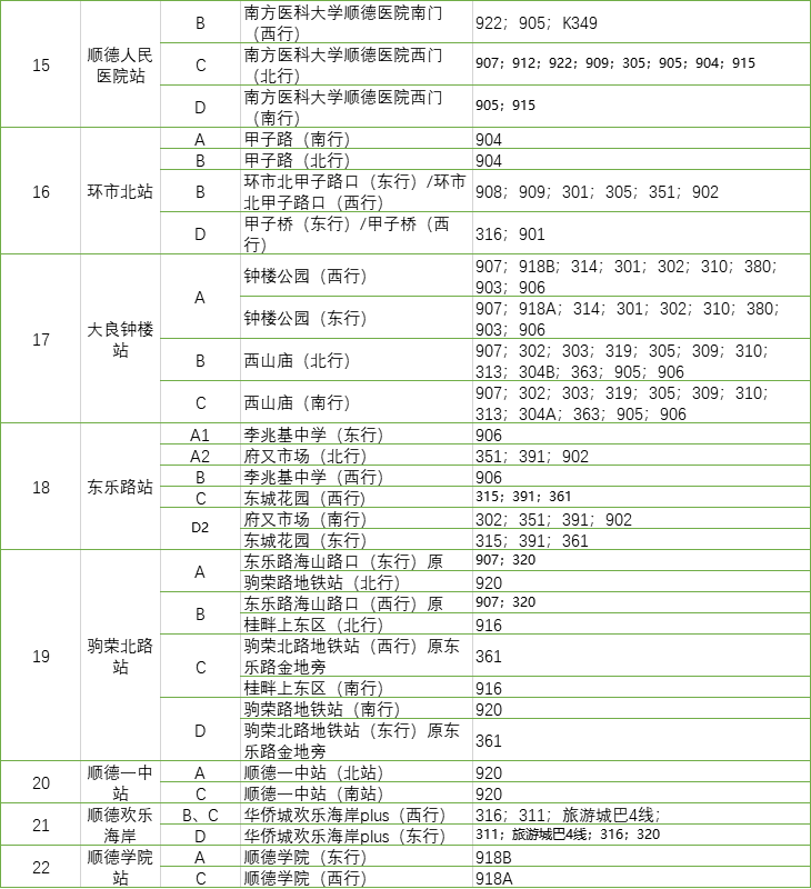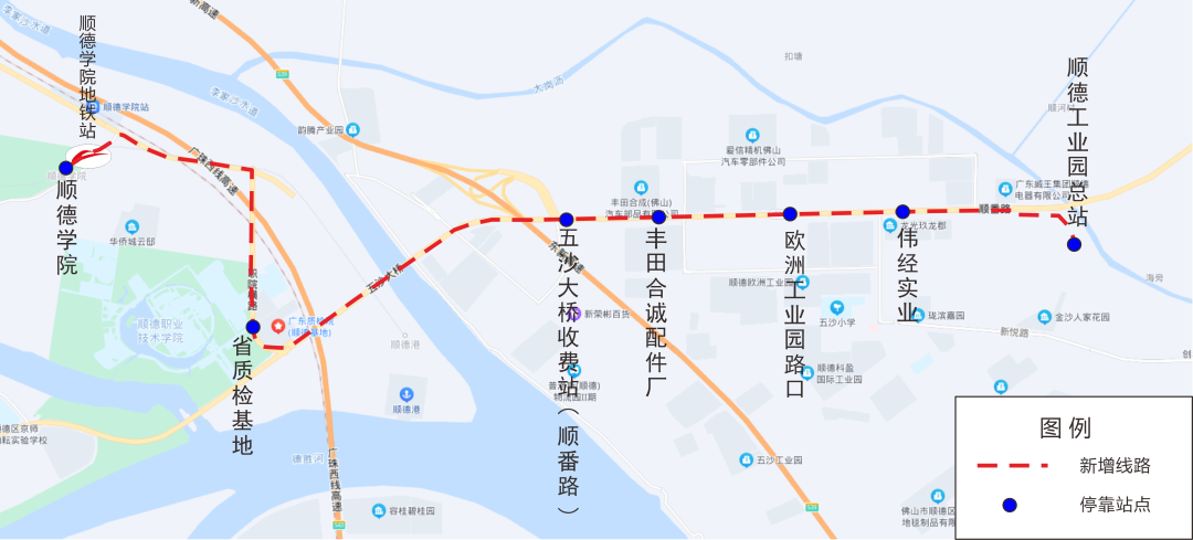 途经站点:顺德学院【接驳三号线顺德学院站】、省质检基地、五沙大桥收费站(顺番路)、丰田合诚配件厂、欧洲工业园路口、伟经实业、顺德工业园总站。