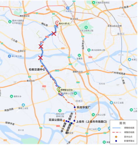 K335路首末站由“顺德客运总站-陈村大桥(北)”调整至“花溪公园北-伦教交通中心”。取消途经佛陈路、白陈路、京珠线(南涌大桥-振华西路),调整途经京珠线(南国路-桂洲大道)、桂洲大道,取消停靠陈村大桥(北)、广珠路陈村路口、林头西、南源路口、工业区大道(世纪路口)、伦教(荔村),增加停靠伦教交通中心、伦教地铁站【接驳三号线伦教站】、科龙华宝厂、上佳市(上佳市市场路口)、鹿茵豪苑、天佑城(桂洲大道中)、瑞英小学、花溪公园北。发班密度、运营时间等均保持不变。原线路可由轨道交通三号线、七号线替代出行。