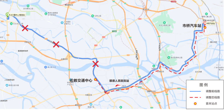 K349路由原“市桥汽车站-乐从交通中心(枢纽站)”截短至“市桥汽车站-伦教交通中心”,取消行驶顺德快速、三乐路、Y005、兴华路、兴乐路,取消停靠工业区大道、三乐路北滘站(美的海岸花园)、三乐路槎涌站、腾冲站、乐从交通中心(枢纽站);停靠伦教交通中心【线路可在南方医科大学顺德医院南门接驳三号线顺德人民医院站】;发班密度、运营时间等均保持不变。