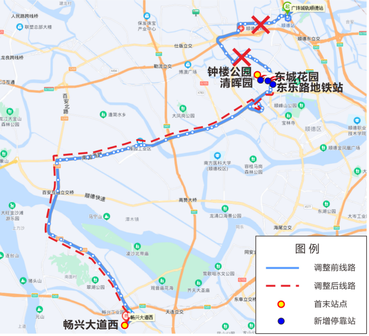顺德工业园总站-顺德学院线路走向示意图