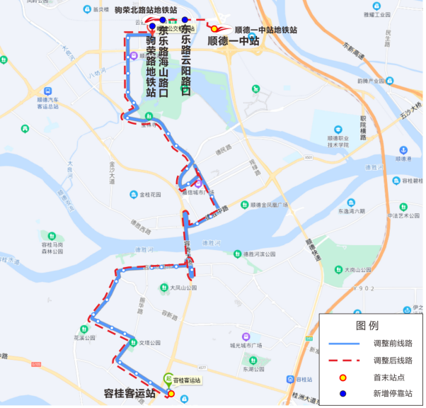 920路首末站由“顺峰公交枢纽站-容桂客运站”延伸至“顺德一中站-容桂客运站”,双向增加行驶东乐路、德智路等路段;取消停靠顺峰公交枢纽站、顺峰山公园,增加停靠顺德一中站【接驳三号线顺德一中站】、东乐路云阳路口、东乐路海山路口【接驳三号线驹荣北路站】、驹荣路地铁站【接驳三号线驹荣北路站】等站点,运营时间,发班密度等保持不变。