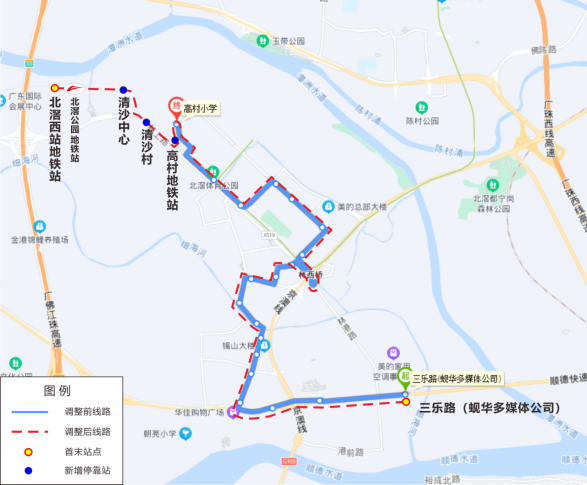 934路首末站由“高村小学-大沙围工业区”延伸至“北滘西站公交站-大沙围工业区”,双向增加行驶裕和路、清沙大道、林上南路等路段;增加停靠清沙村、清沙中心、北滘西地铁站【接驳三号线北滘西站】、高村地铁站【接驳三号线高村站】等站点,运营时间,发班密度等保持不变。