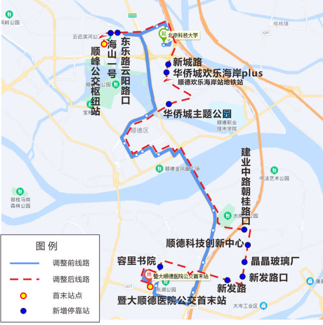 该线路调整后可加强容桂与轨道交通三号线顺德欢乐海岸站衔接,方便市民乘坐地铁,同时加密顺德新能源汽车小镇周边公交服务。