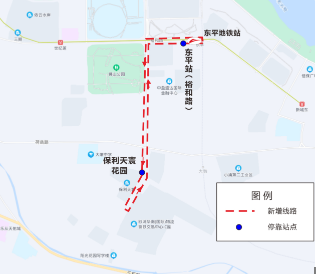 途经站点:东平站(裕和路)【接驳广佛线、三号线东平站】,保利天寰花园站