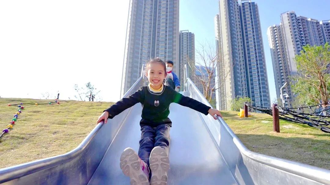 沿河涌向东,孩子们的欢声笑语越来越近。在流线型的艺术地形间穿梭跑跳,在大树下的沙坑里,和小伙伴一起堆沙堡,从安全光滑的滑梯上肆意俯冲,钻“山洞”、爬网架、在专属“秘密基地”,孩子们玩得不亦乐乎。