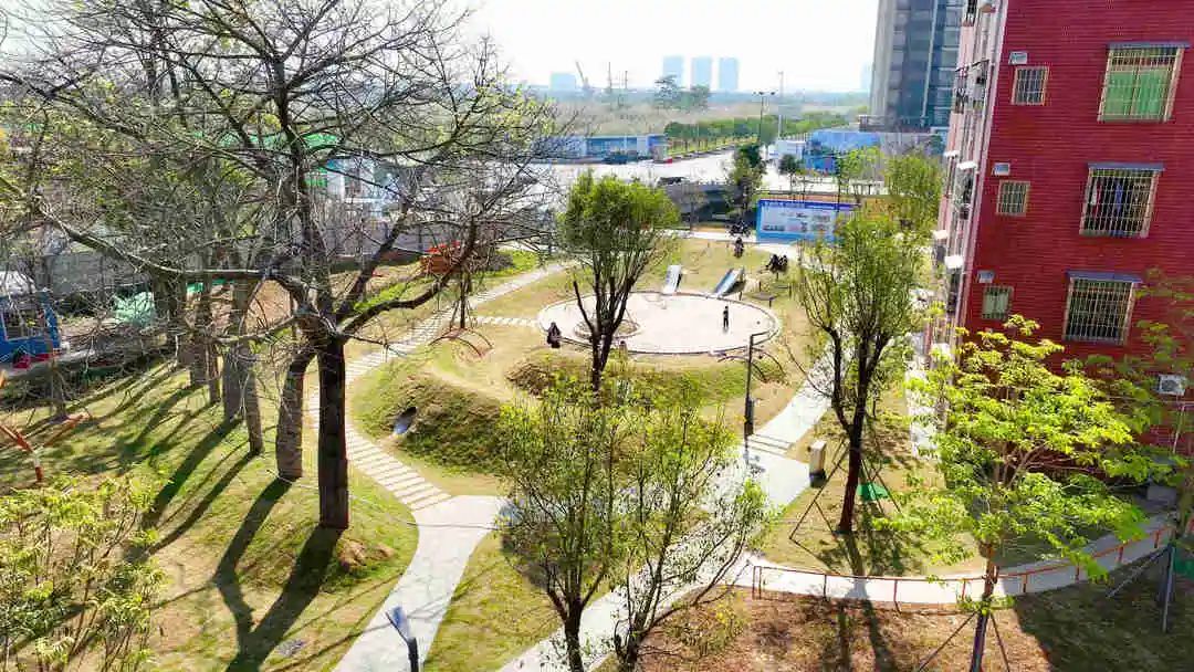 在陈村镇潭洲村,便有这样一片专门为儿童量身打造的滨水空间——潭洲木趣森林公园。设计方案以“崇尚自然、回归童趣”为理念,将儿童游乐项目融入森林和草坪的元素中,结合流动的艺术地形,构建一个既能玩耍也能休息的生态娱乐社区空间。