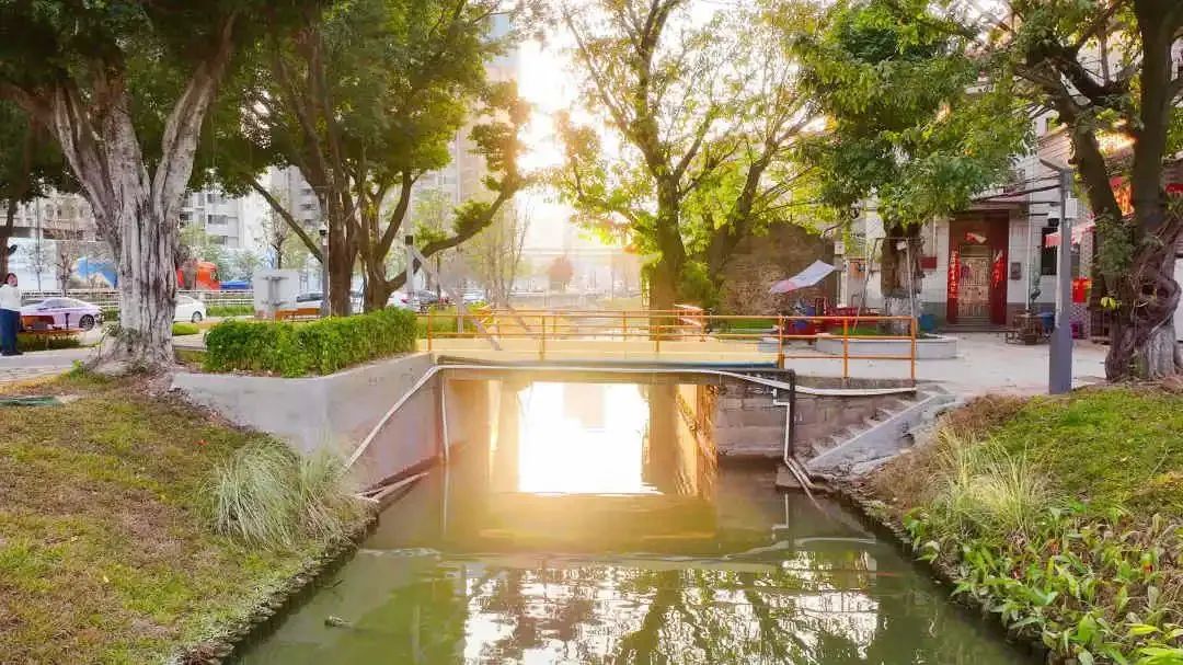 继续沿草地小路向北,便来到前街涌河岸,坐在充满原木风格的亲水挑台,小桥流水、祠堂人家的水乡风光一览无余,身旁的河涌边,美人蕉花开正艳,游鱼嬉戏追逐。沿着精心铺就的小路经过古朴村落,桥头几棵百年老树洒下斑驳枝影,与亲友围坐其间,俯仰之间看水面倒映斜阳旧宅,波光温暖写意。