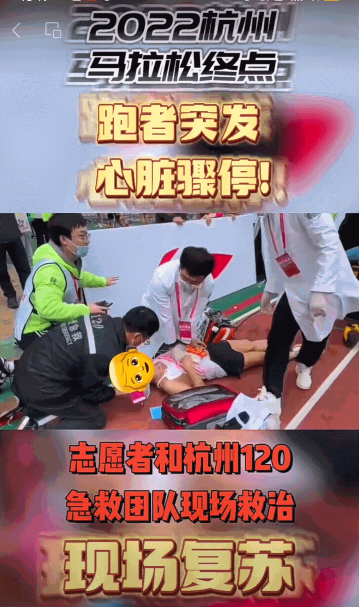 2022年11月20日,杭州马拉松赛道终点,一名跑者在冲过终点后倒地,突发呼吸、心脏骤停,急救团队现场救治并送到医院,所幸身体无大碍。