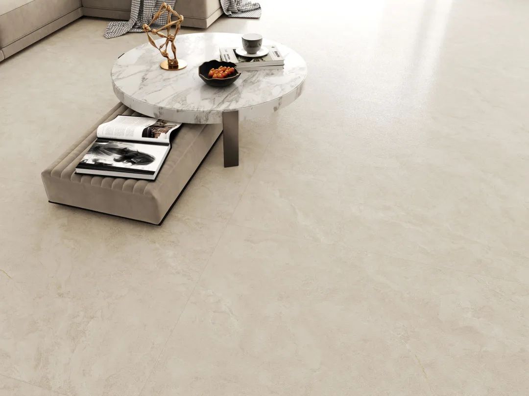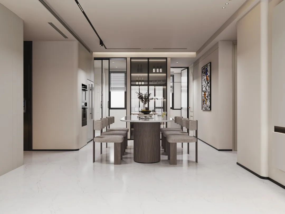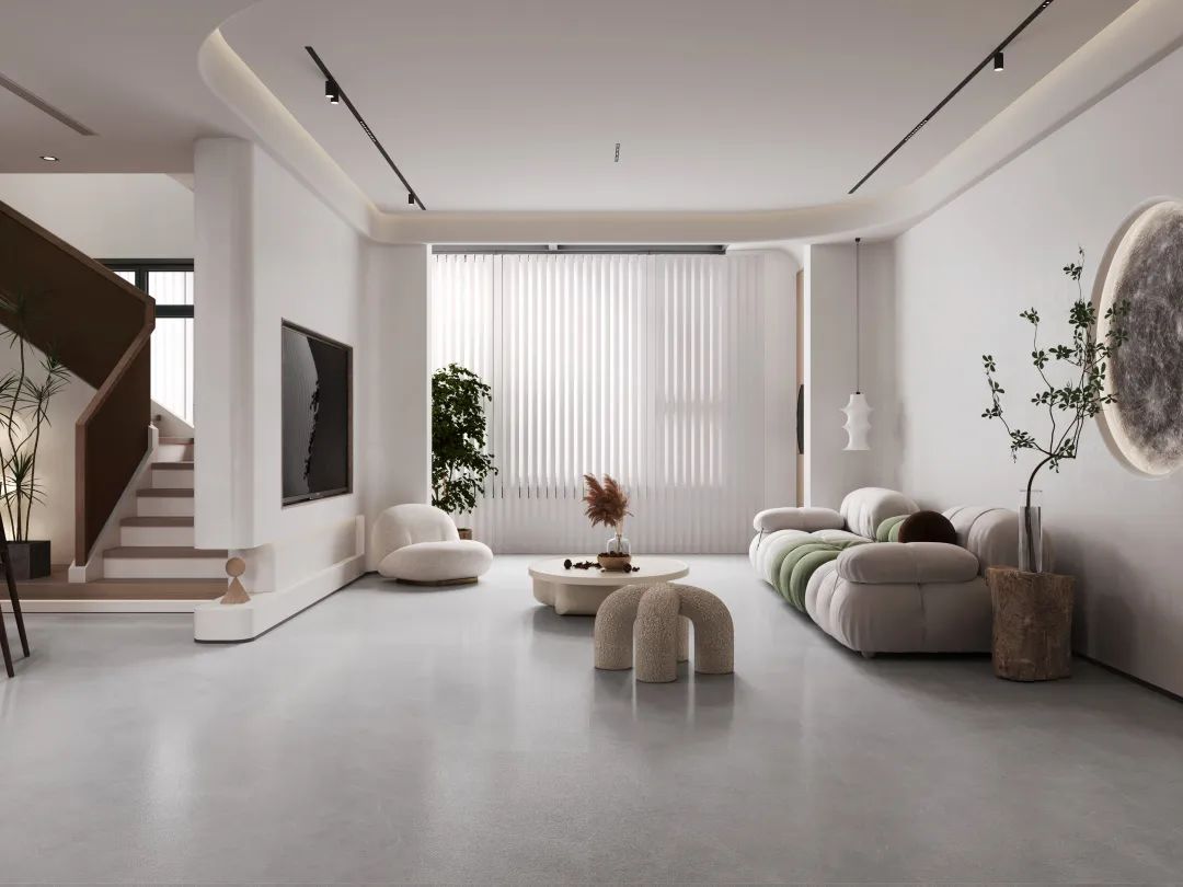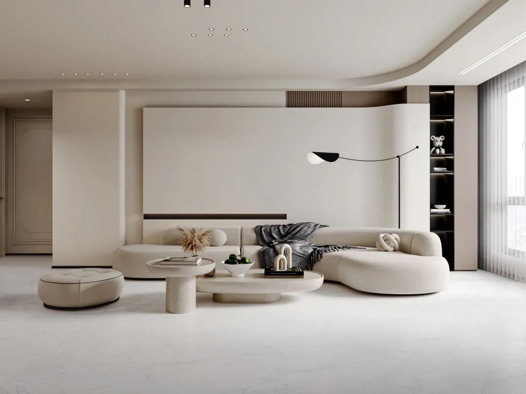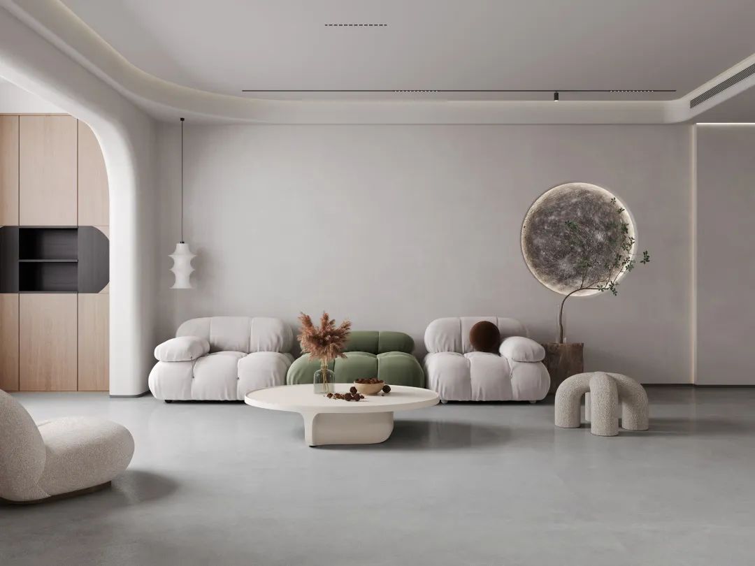 地面通铺丝路白,安静而惬意,含蓄又不乏变化的肌理,淡雅中不乏沉稳的气质,自然间又映射出品质与格调,给人以舒适放松的视觉感受。墙地颜色统一,再用一些装饰品加以点缀,整个空间灵动了起来。