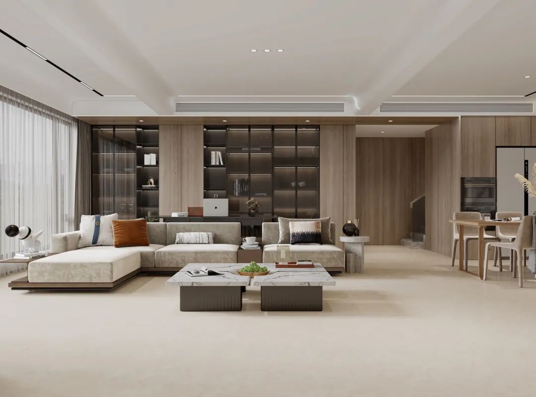 丝路米+原木风,浅黄色为空间主色调,营造温暖、愉悦的氛围,让人们在繁忙的生活中找到片刻的宁静和放松。岩板材质的方形茶几,摆上一些水果和精致的小饰品,丝绒沙发搭配不同颜色的抱枕,让你能慵懒地享受生活。