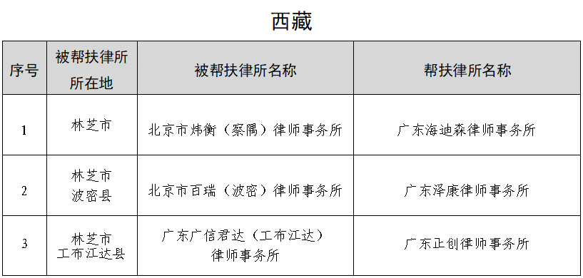 建立健全律师行业东中西部对口帮扶机制,是深入贯彻落实习近平总书记重要指示精神、加快解决有些地方没有律师和欠发达地区律师资源不足问题的重要举措,佛山市律师协会组织了广东海迪森律师事务所、广东南天明律师事务所、广东泽康律师事务所、北京隆安(顺德)律师事务所、广东至高律师事务所、广东正创律师事务所等6家律师事务所与西藏、青海6家律师事务所开展结对帮扶工作。