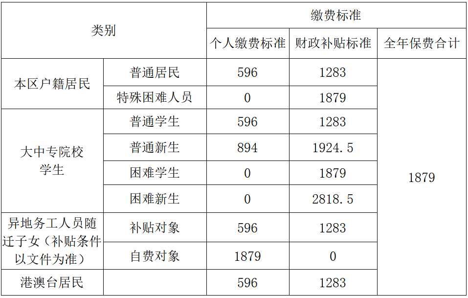 2024年居民医保缴费标准和2023年维持不变,总金额为1879元,其中个人缴费部分为596元,财政补贴部分为1283元。(点击回顾详情→)