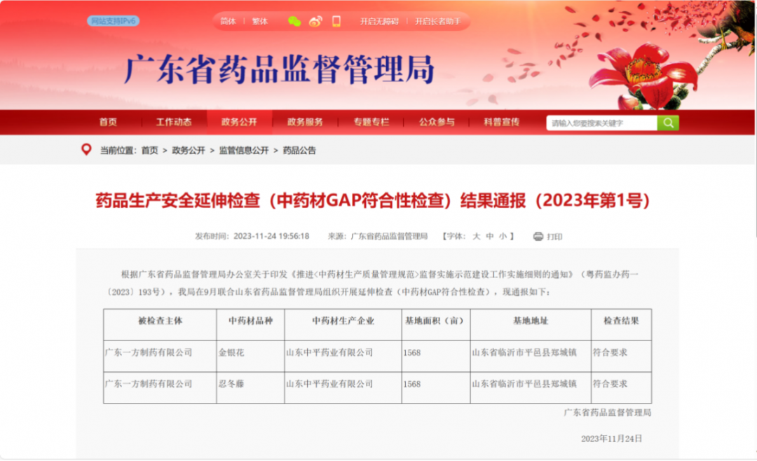 11月24日,广东省药品监督管理局发布《药品生产安全延伸检查(中药材GAP符合性检查)结果通报》(2023年第1号),通报显示,广东一方制药有限公司与山东中平药业有限公司共建的金银花、忍冬藤GAP基地通过新版GAP符合性检查。这是自2022年3月国家药监局、农业农村部、国家林草局、国家中医药局联合发布《中药材生产质量管理规范》(简称:新版GAP)以来,全国首个通过新版GAP符合性检查的企业。