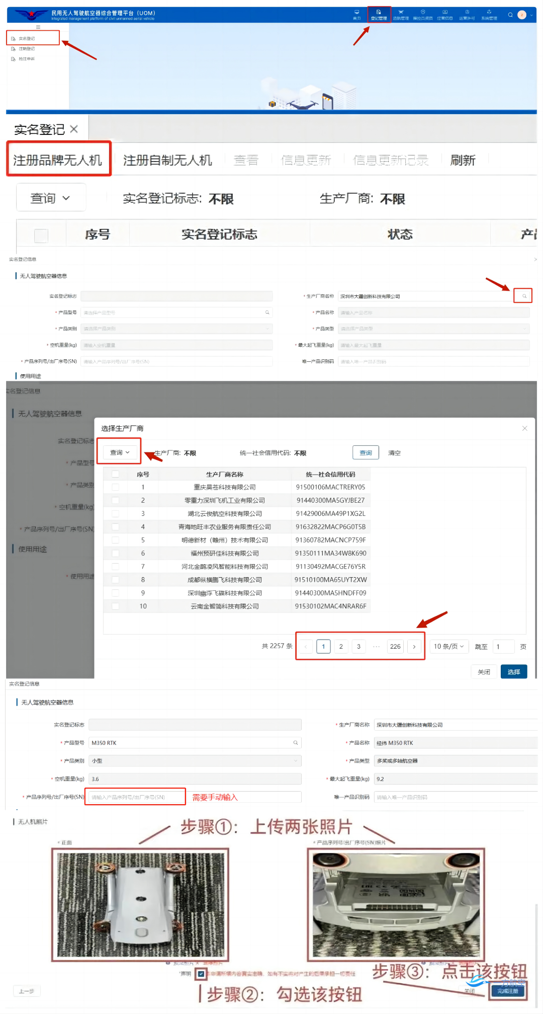 登录好进入首页——点击右上角登记管理——实名登记——注册品牌无人机——验证所有人信息——手机扫码刷脸验证——选择生产商名称(可一页页看,也可直接输入搜索)——选择型号等相关信息(序列号需手动输入)——根据要求长传照片——完成注册。