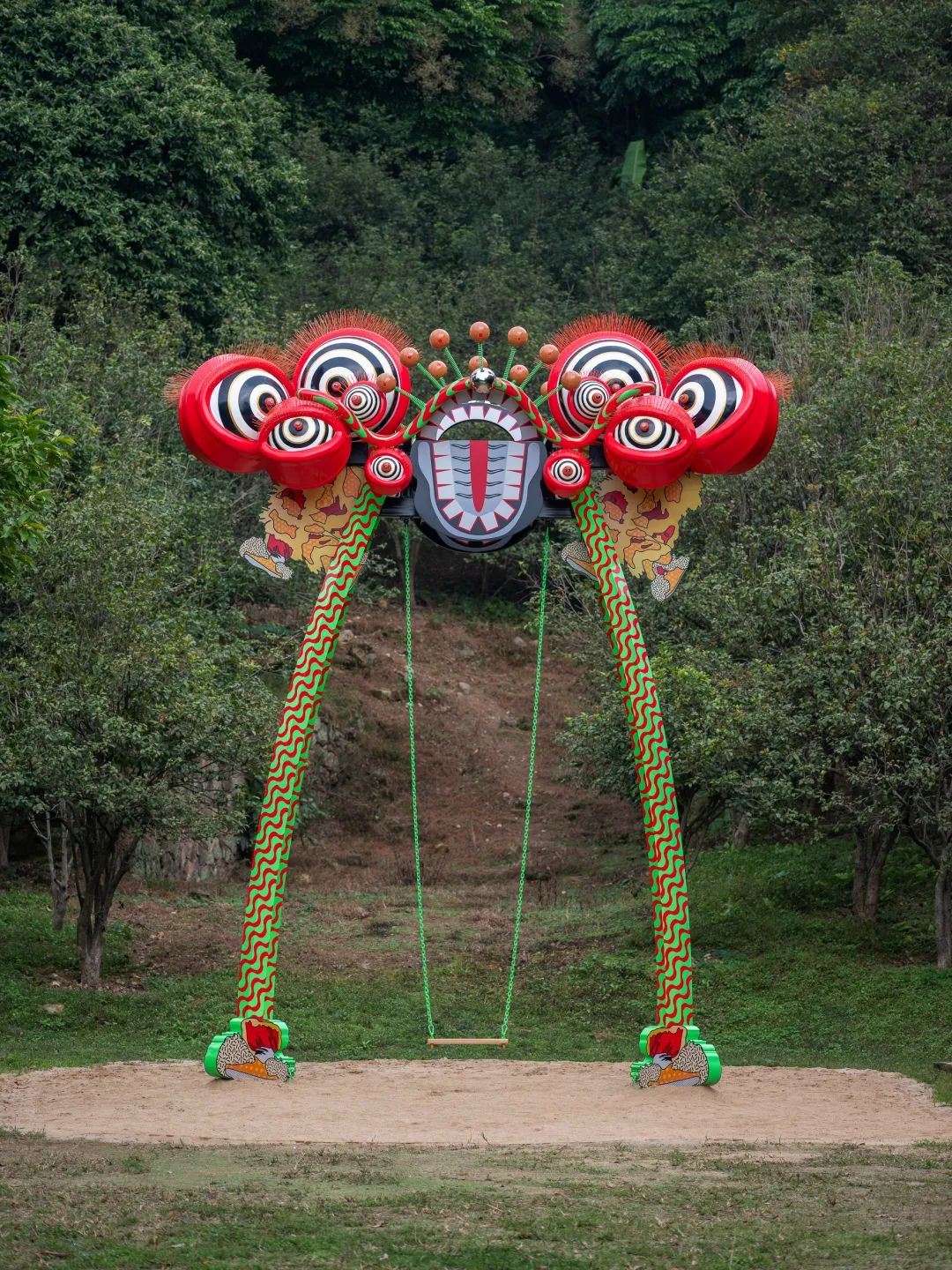 荡完高升的秋千,好运在摇曳。BAM 百安木《高升》秋千的摇摆带来了岭南的吉祥祝福,也带来了“高升”的好运。支撑柱模拟“四方竹”与狮脚相连,四只长长的“好运脚”支撑在地面上,正所谓“摸摸狮子脚,幸福少不了”。