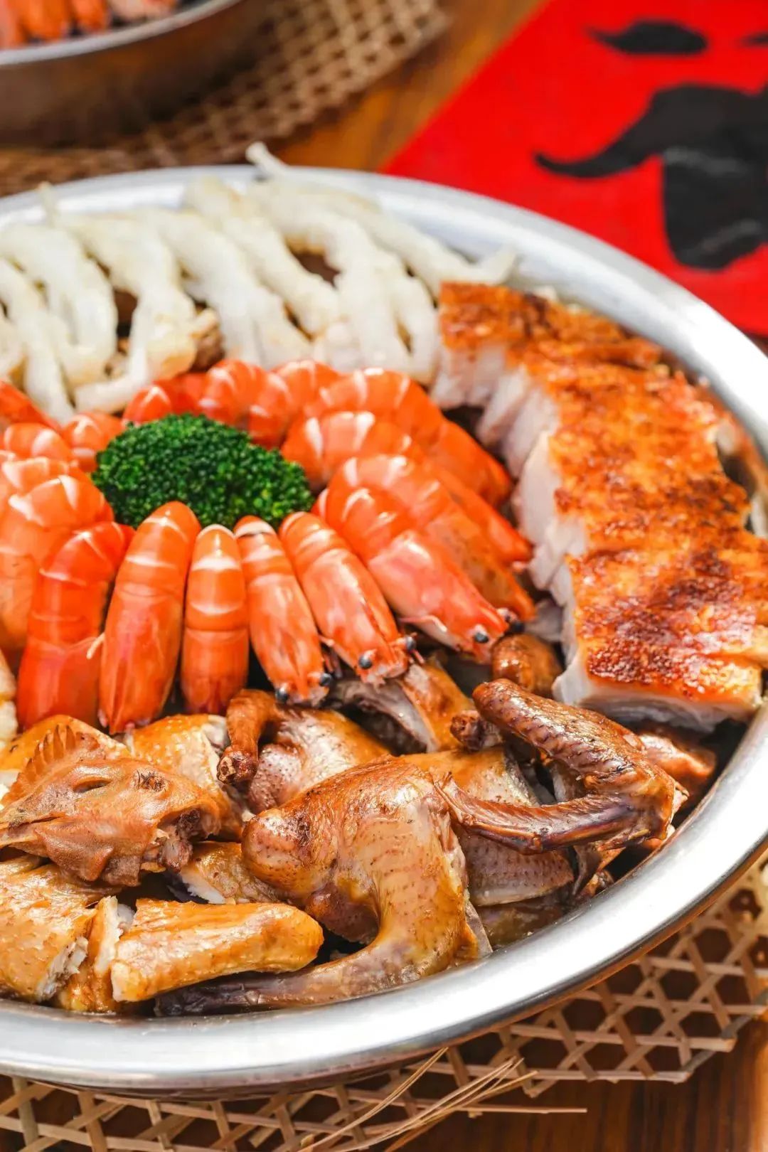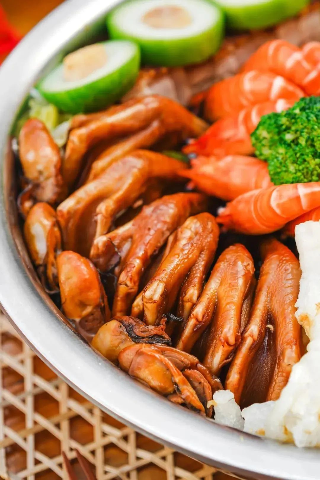 其中最为特色的,就是新春盆菜。顺德人吃的盆菜,必须要有这些食材:发菜、蚝豉、瑶柱、猪手,寓意横财就手;掌翼、脆皮烧肉寓意大展宏图;四杯鸡寓意金鸡报喜;罗氏虾则代表笑口常开。