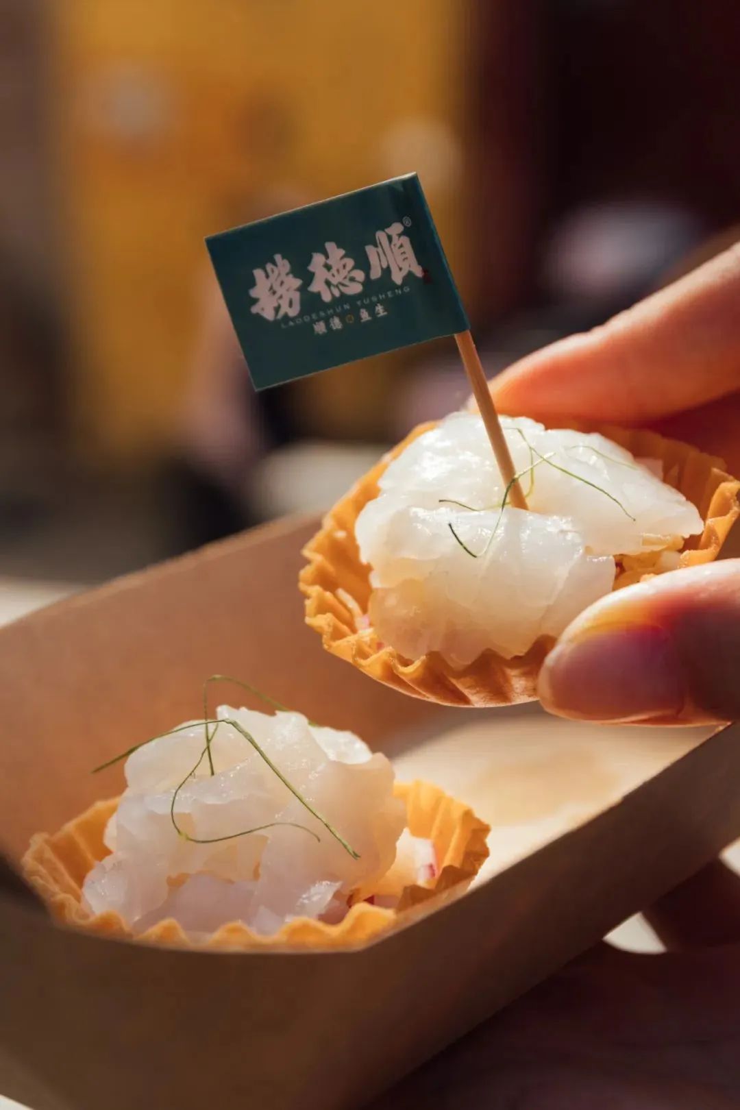 如今鱼生除了传统的整盘做法,捞德顺的冯俊杰还想出了“一口鱼生”的外带做法,随时随地都可以让大家吃到新鲜鱼生。
