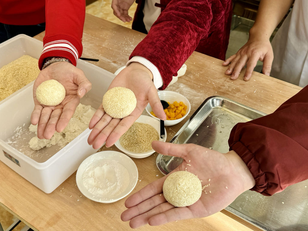 三位主讲人展示自己亲手做的煎堆。