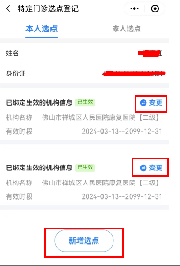 5、点击“新增选点”/“变更”,选择需要前往就诊的医疗机构即可。