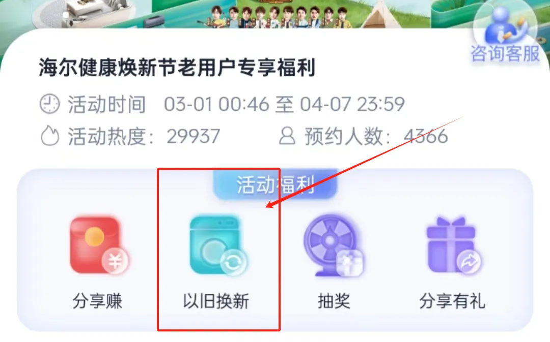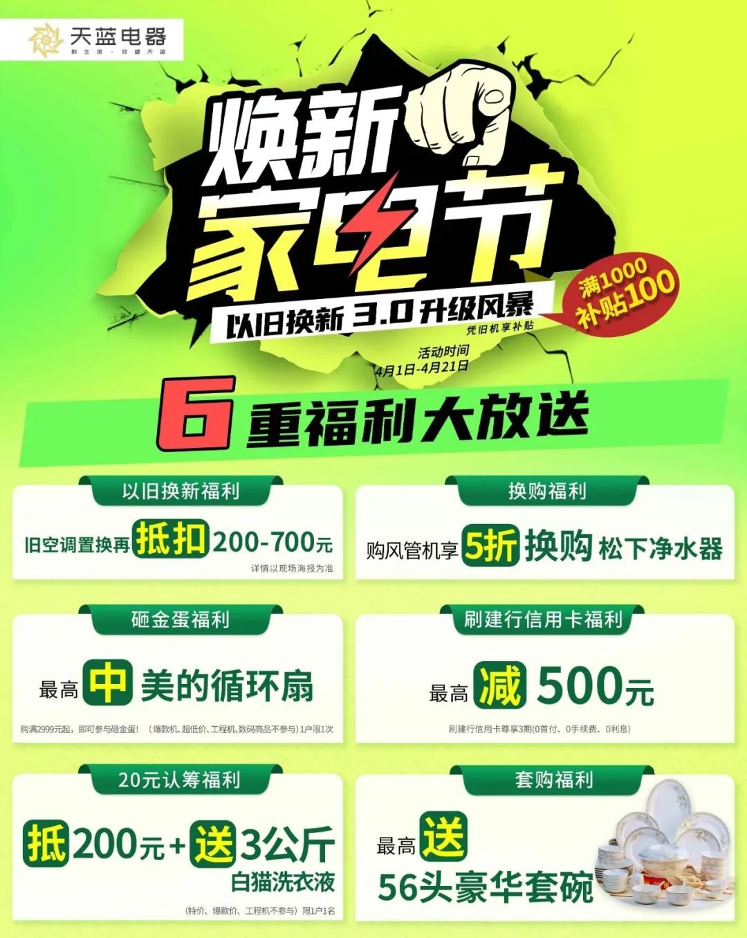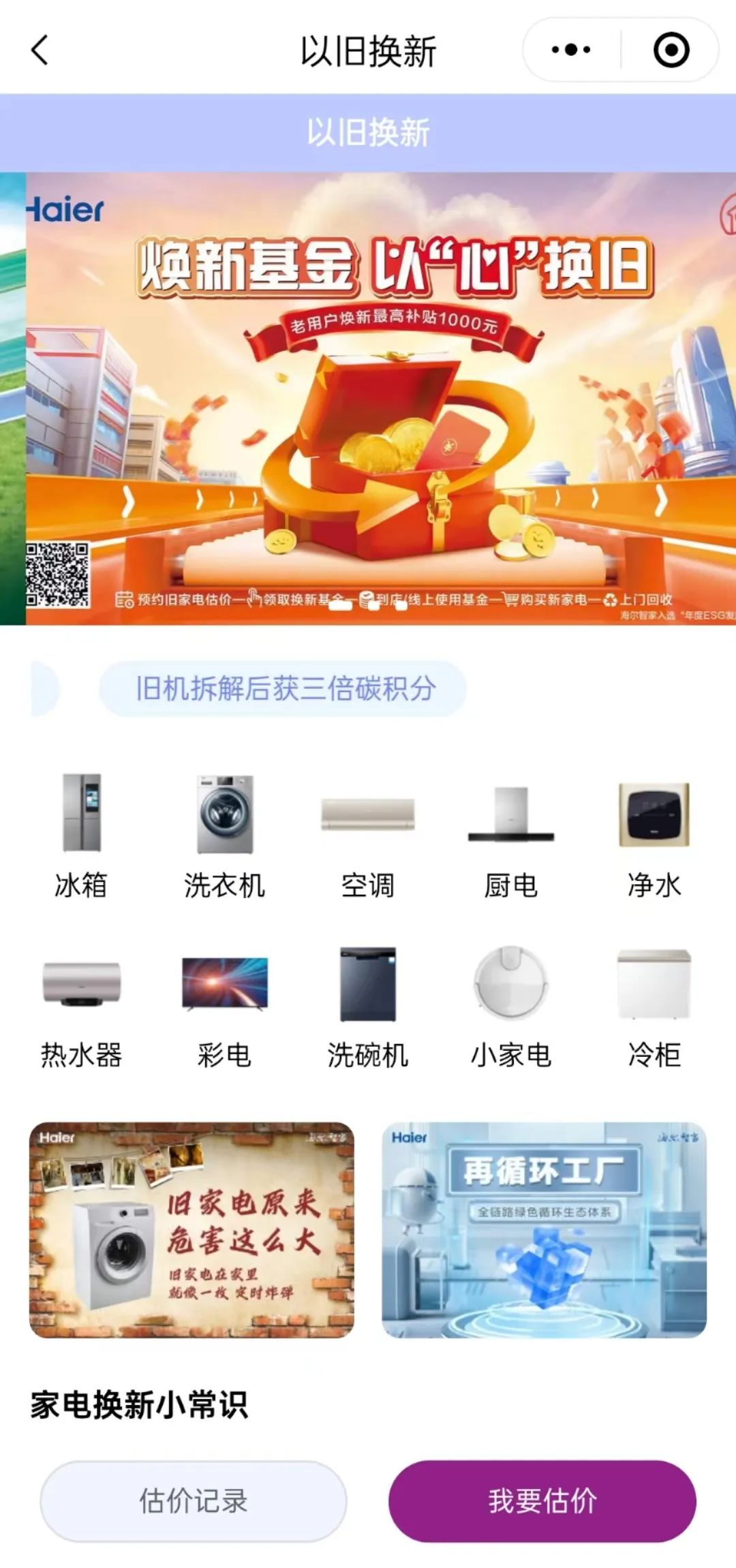 本次活动自2024年3月29日起。资金总额为5000万元,补贴资金用完即止。本次活动补贴分为家电、汽车两类。家电补贴范围包括空调、冰箱、洗衣机、厨卫电器、全屋用水、彩电、洗碗机7类,购买汽车范围包含全车品。活动期间,向海尔专卖店交售旧家电,并在门店购买焕新美好生活产品的用户,可享受海尔“以旧换新”补贴。交售旧家电的个人与购买人必须一致。>>点击查看详情换新成交价=零售价-(折旧券+焕新券+活动其他补贴优惠)消费者可对旧家电进行估值,最高可获1000元折旧券,该券到线下海尔专卖店店核销使用。旧机评估可通过“海尔空调”微信公众号、海尔智家App或门店咨询等渠道参与并领券。