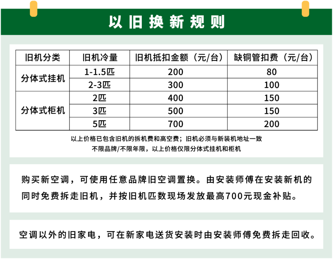 购买新家电范围有空调、冰箱、洗衣机、厨卫电器和生活小家电5类家电。活动期间,向美的专卖店交售旧家电,通过门店购买绿色智能家电库机型的用户,可享受美的家电“以旧换新”补贴。交售旧家电的个人与购买人必须一致。>>点击查看详情换新成交价=零售价-(绿色智能家电优惠券+旧机回收价格+新机补贴券+活动其他补贴)派发50元绿色智能家电优惠券。消费者通过“美的到家”小程序领取,到线下美的专卖店核销。每个ID可领5张,单笔限用1张,总计可享补贴250元。工作人员到家回收美的旧家电,回收价格标准为:空调柜机500元/台,挂机270元/台,其他家电10-160元不等。消费者直接通过“美的到家”小程序进行价格评估,可选择到家回收或到店回收。通过“美的到家”小程序领取新机补贴券,每个ID可领3张。消费券到线下美的专卖店核销使用,单台至高补贴1000元。补贴详情识别下方二维码查看:“美的绿色家电库”产品清单