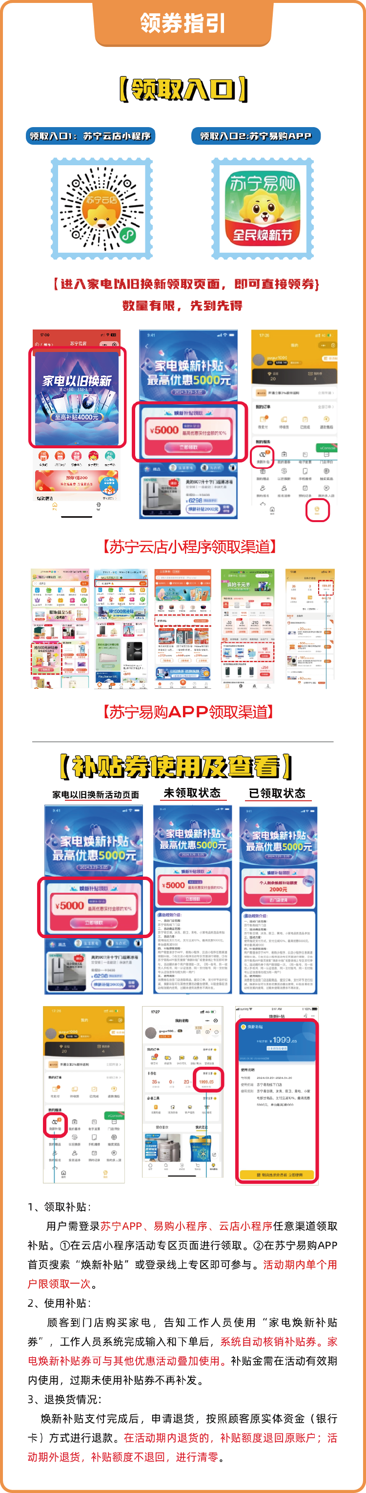 用户需登录苏宁APP、易购小程序、云店小程序任意渠道领取补贴。