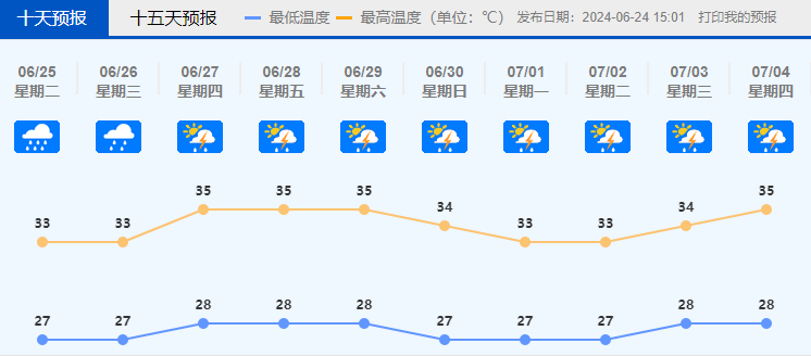 6月27日,多云到晴,有雷阵雨,28℃-35℃。