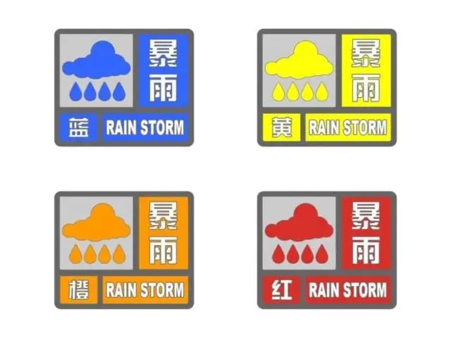 我国暴雨预警信号分为蓝、黄、橙、红四级。