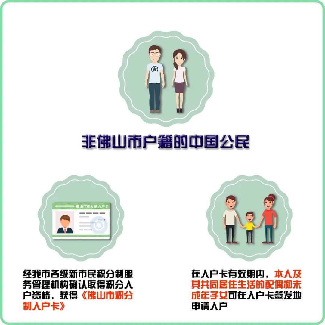 经我市各级新市民积分制服务管理机构确认取得积分入户资格,获得《佛山市积分制入户卡》(简称入户卡)的,在入户卡有效期内,本人及其共同居住生活的配偶和未成年子女可在入户卡签发地申请入户。