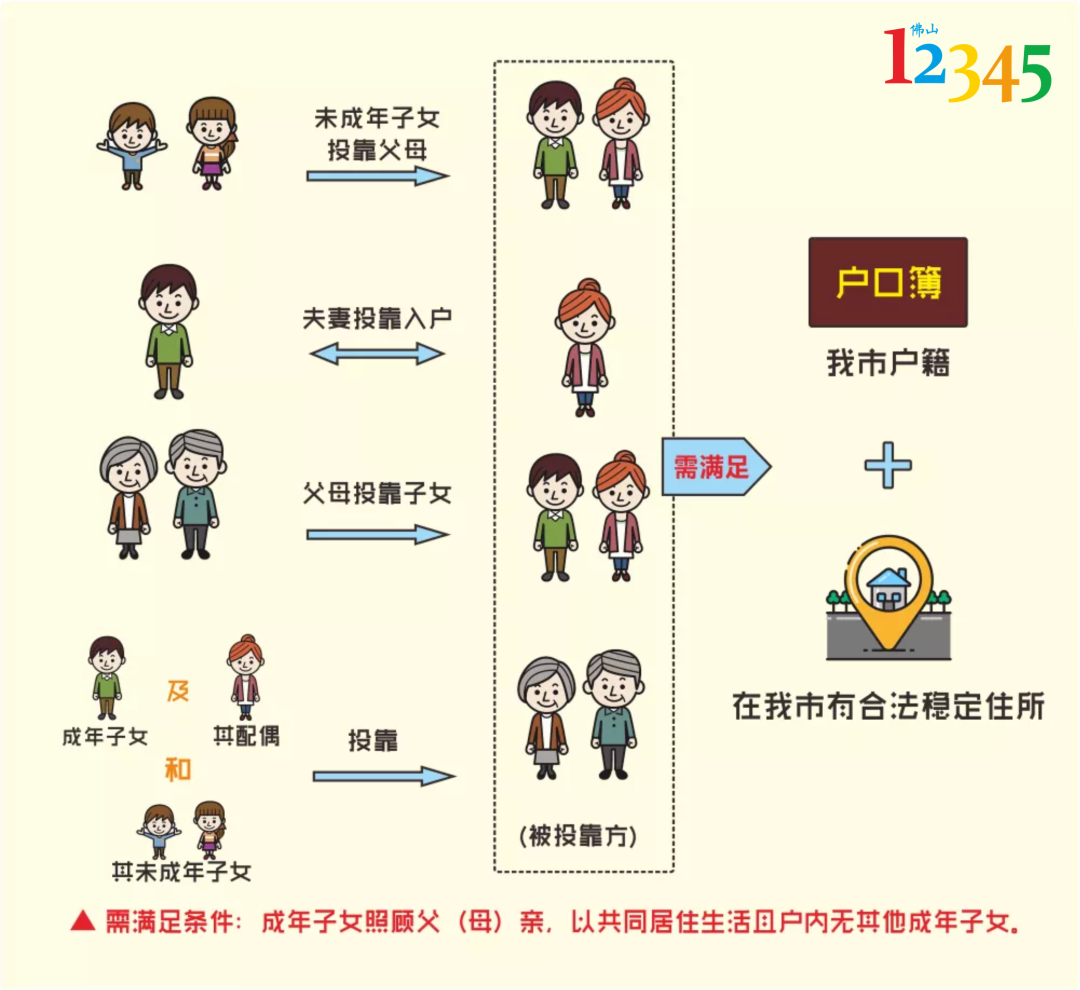 已在我市办理居住证,且已由就业地所在区人社部门签发《佛山市高技能人才入户卡》的,本人及其配偶和未成年子女、共同居住生活的父母可申请入户。