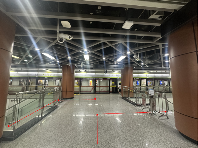 按照指引,先坐扶梯到站厅层,再由站厅层下到广佛线站台,实测将近1分30秒。