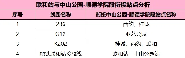 ● 286、K202等4条公交线路接驳地铁3号线中山公园至顺德学院段相关站点,其中包括1条由地铁联和站至地铁中山公园站的公交接驳专线,以此加强轨道站点之间的联系。
