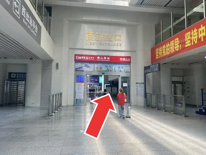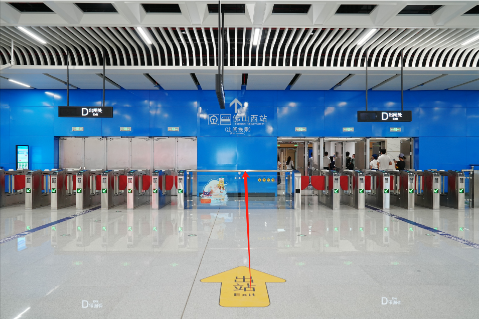 由地铁站D出闸处出闸,按照指示走到佛山西站西进站口乘坐高铁或城轨,大约3-6分钟,其中需要过一次安检。