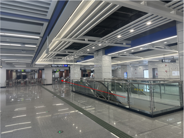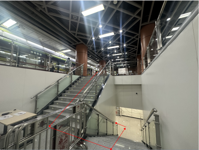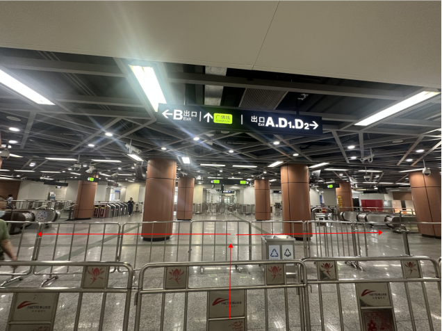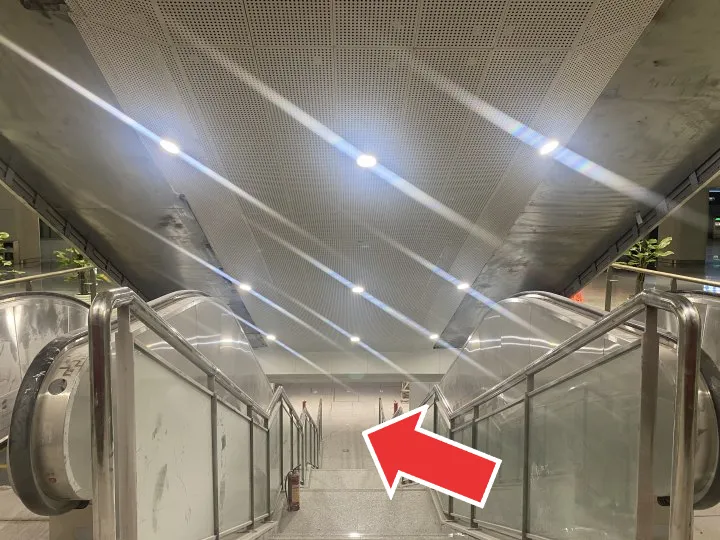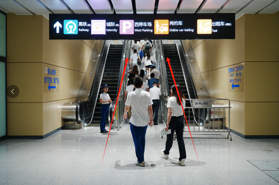 第一步:由地铁站D出闸处出闸,穿过走廊到换乘通道的入口,搭乘两层扶手电梯,来到佛山西站西进站口前的扶梯位置。