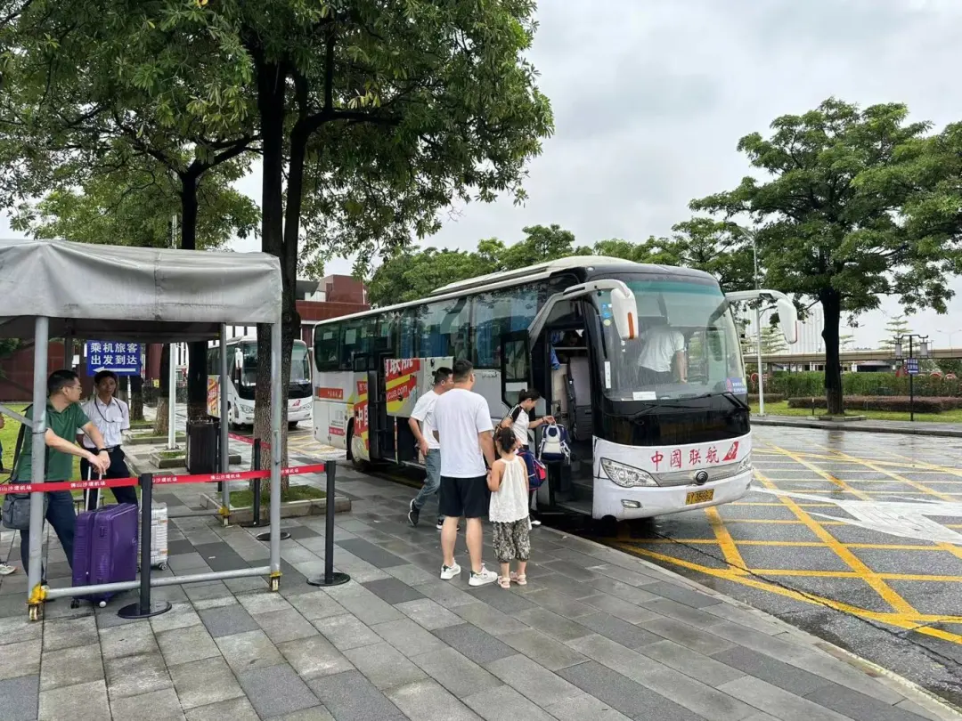 从B出口出站后,左转直走往前步,行约2分钟即可乘坐接驳巴士前往机场。