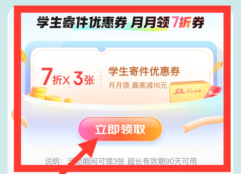 京东APP进入“学生专区”,完成学生认证后,即可享受京东校园专区优惠。此外,在京东APP进入“京东快递”,可领取寄件优惠券(开学寄快递回学校有折扣)。