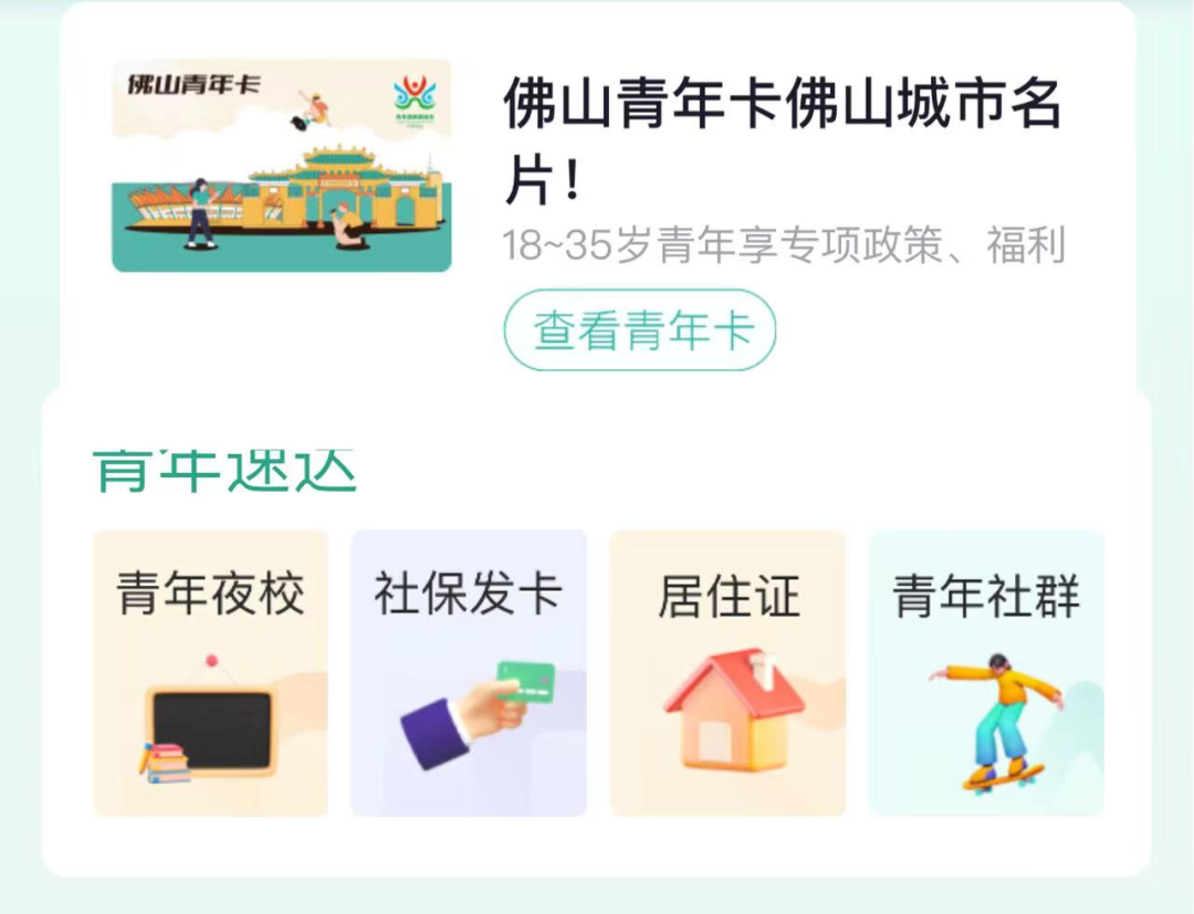 全市18-35岁已注册领取“佛山青年卡”的青年可报名参与青年夜校、申领社保发卡、加入青年社群。