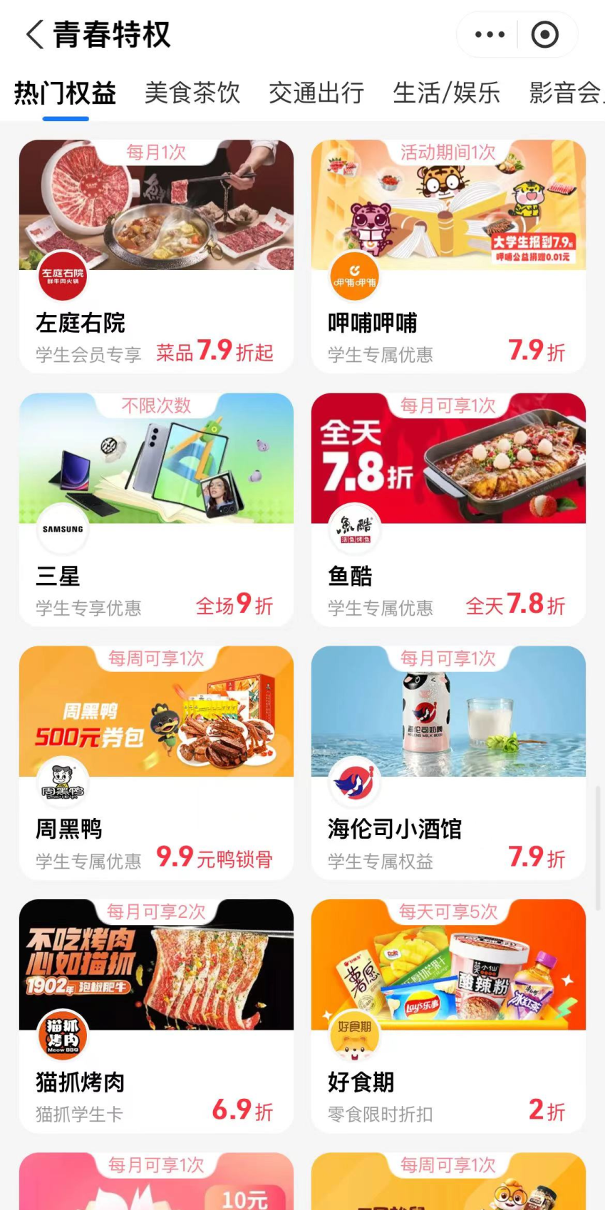 支付宝的“青春特权”中,完成学生认证后可享众多优惠。