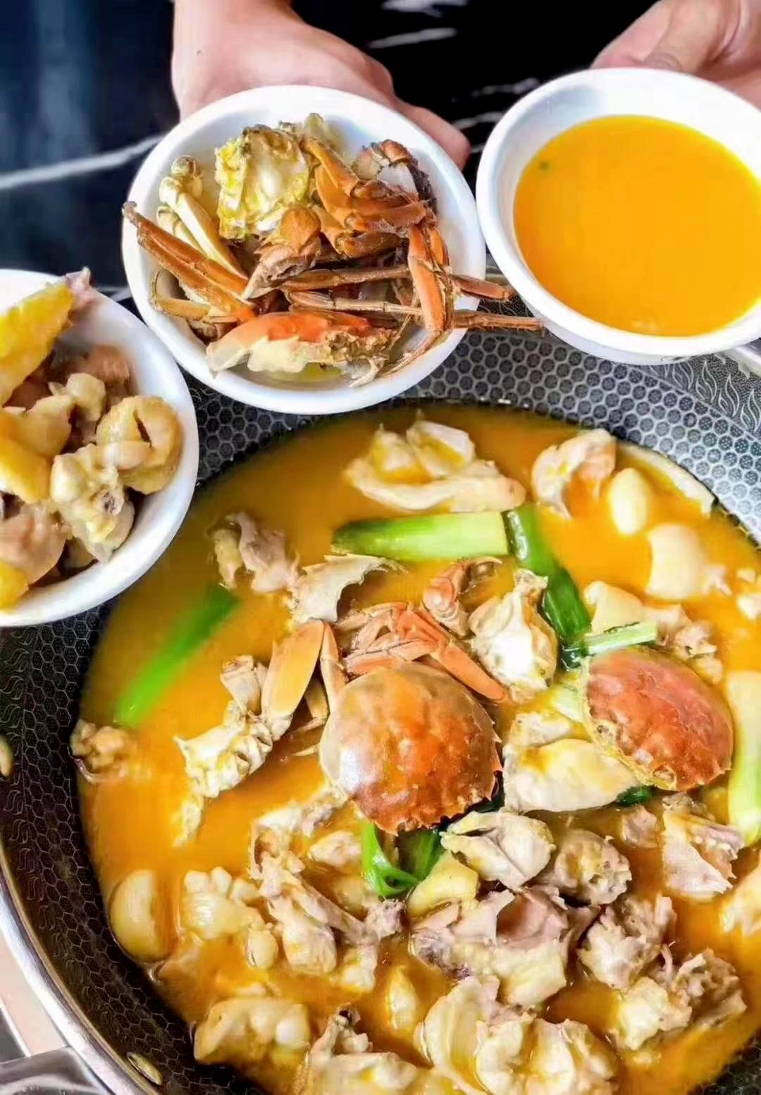 古人说“蟹为五味俱全之物,其鲜无比”,白坭鸡煲蟹取材果园走地鸡,加上满满蟹膏蟹油的西江毛蟹,配上独有的汤汁,汤色金黄,入口顺滑浓稠,鲜香四溢。