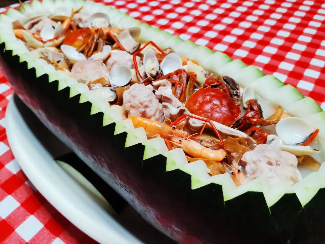 黑皮冬瓜是佛山三水的国家地理标志农产品,而冬瓜船就是三水的特色美食。将冬瓜打横放置,打造出“船”的效果,视觉效果拉满。冬瓜船里可加入河鲜、鸡肉等多种食材,能满足不同食客的喜好,因此大受欢迎。